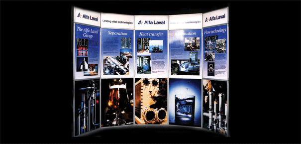 Till Alfa Laval lät vi ta fram affischer för koncernens olika affärsområden. Dessa användes i huvudsak till skärmutställningar vid seminarier och mässor världen över. I text och bild presenterar man på ett enkelt sätt sina olika verksamhetsområden. Det här vikskärmssystemet är baserat på 70x100 cm ramar. Vi valde att bygga ut systemet på höjden med "toppskyltar", där Alfa Lavals logotype tydligt exponeras. Systemet viks enkelt ihop utan att man behöver ta ut 70x100 skyltarna, vilket underlättar när man ska flytta det och snabbt få det på plats någon annanstans.