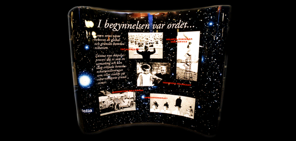 Genom att använda magnetiska lister i utställningssystemet kan du på ett häpnadsväckande sätt skapa en hel utställning utan synliga skarvar. De är lika enkla att montera som att transportera. Modern foto- och datateknik skapar närmast gränslösa möjligheter för exponeringar av ditt budskap. Till Telia skapade vi denna svängda och lite blanka utställningsskärm till deras foajé.
